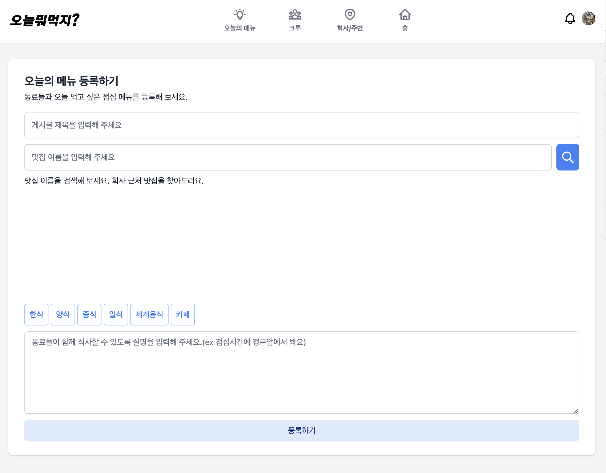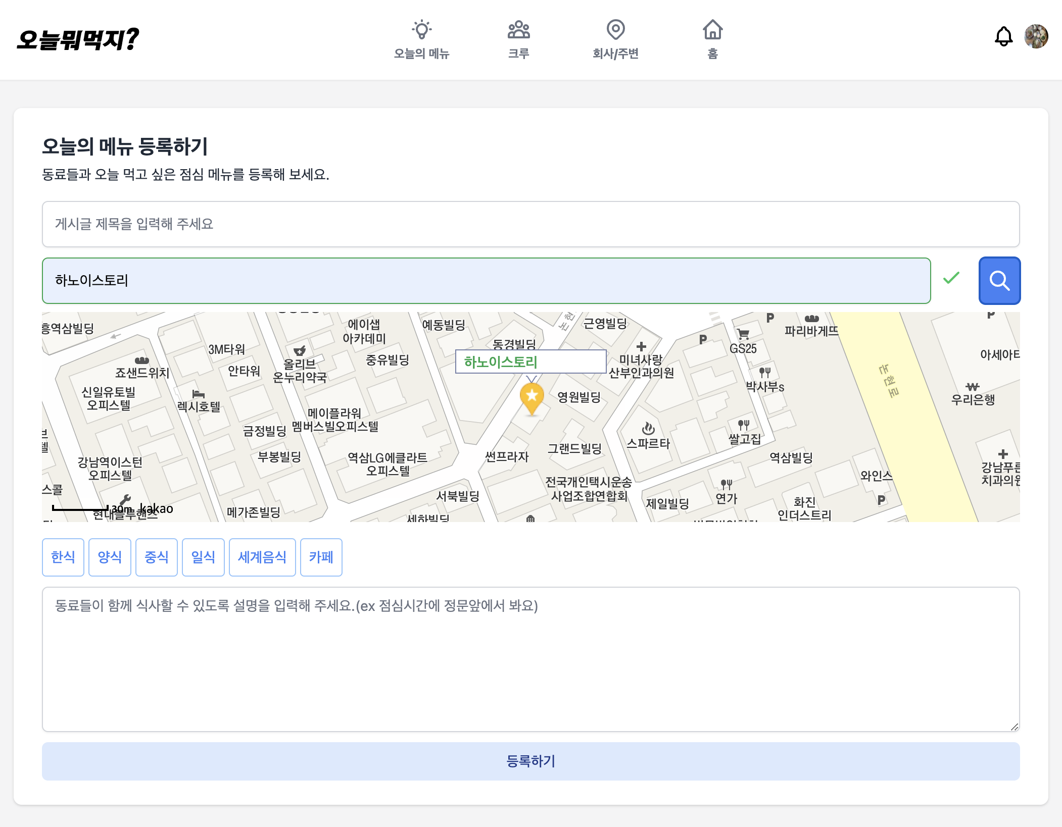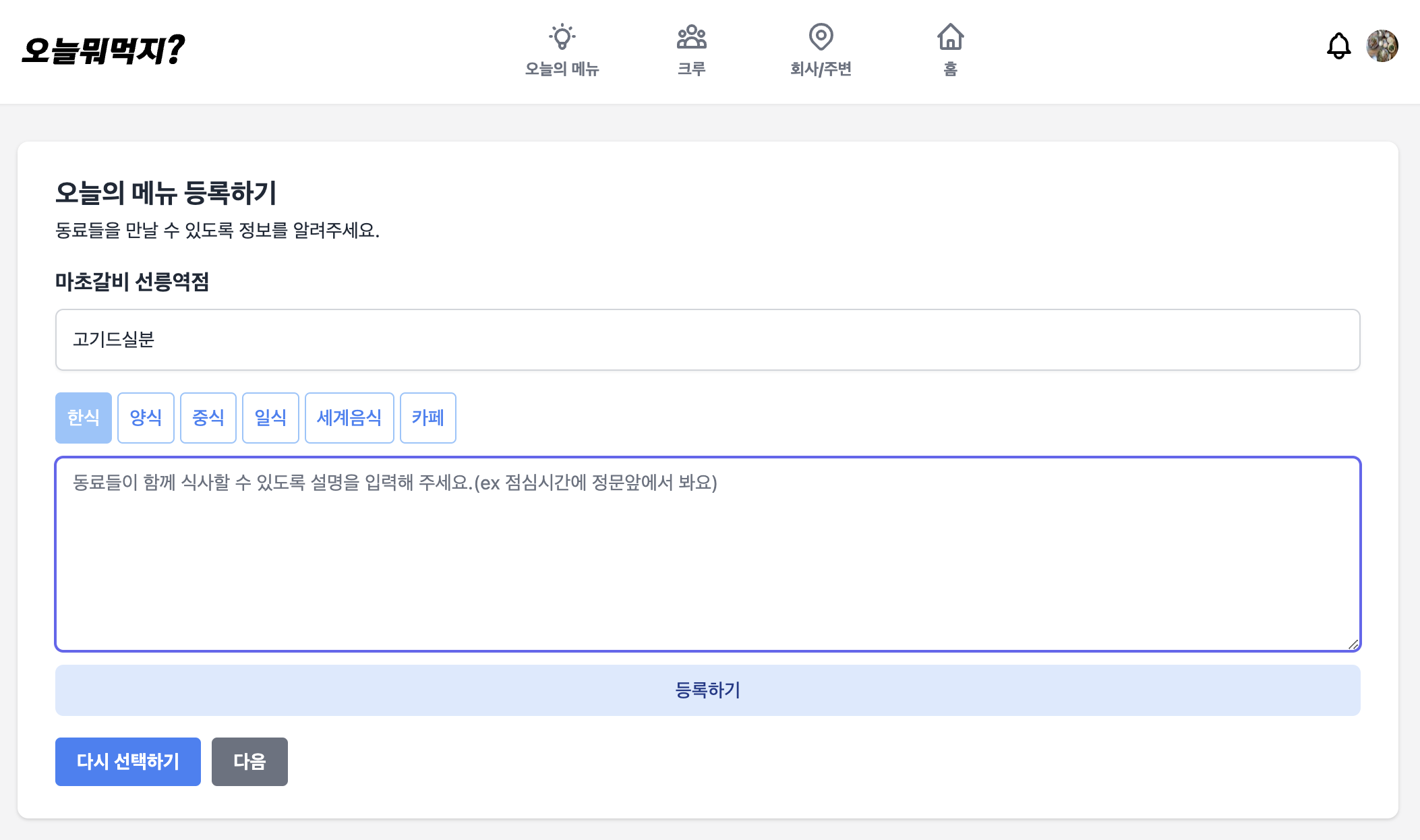 맛집 이름을 검색하면 맛집 선택이 가능한 목록이 표시됩니다. 목록에서 맛집 선택시 지도 중심이 해당 맛집으로 포커싱됩니다. 원하는 결과가 없을 시 지도 없이 등록하기 버튼을 통해 맛집 이름만으로 등록할 수 있습니다. 회사 주변에서 검색하기 버튼이 옵션으로 추가되었습니다. 맛집을 선택하면 다음으로 넘어가 추가 정보를 입력하고 오늘의 메뉴를 등록할 수 있습니다.