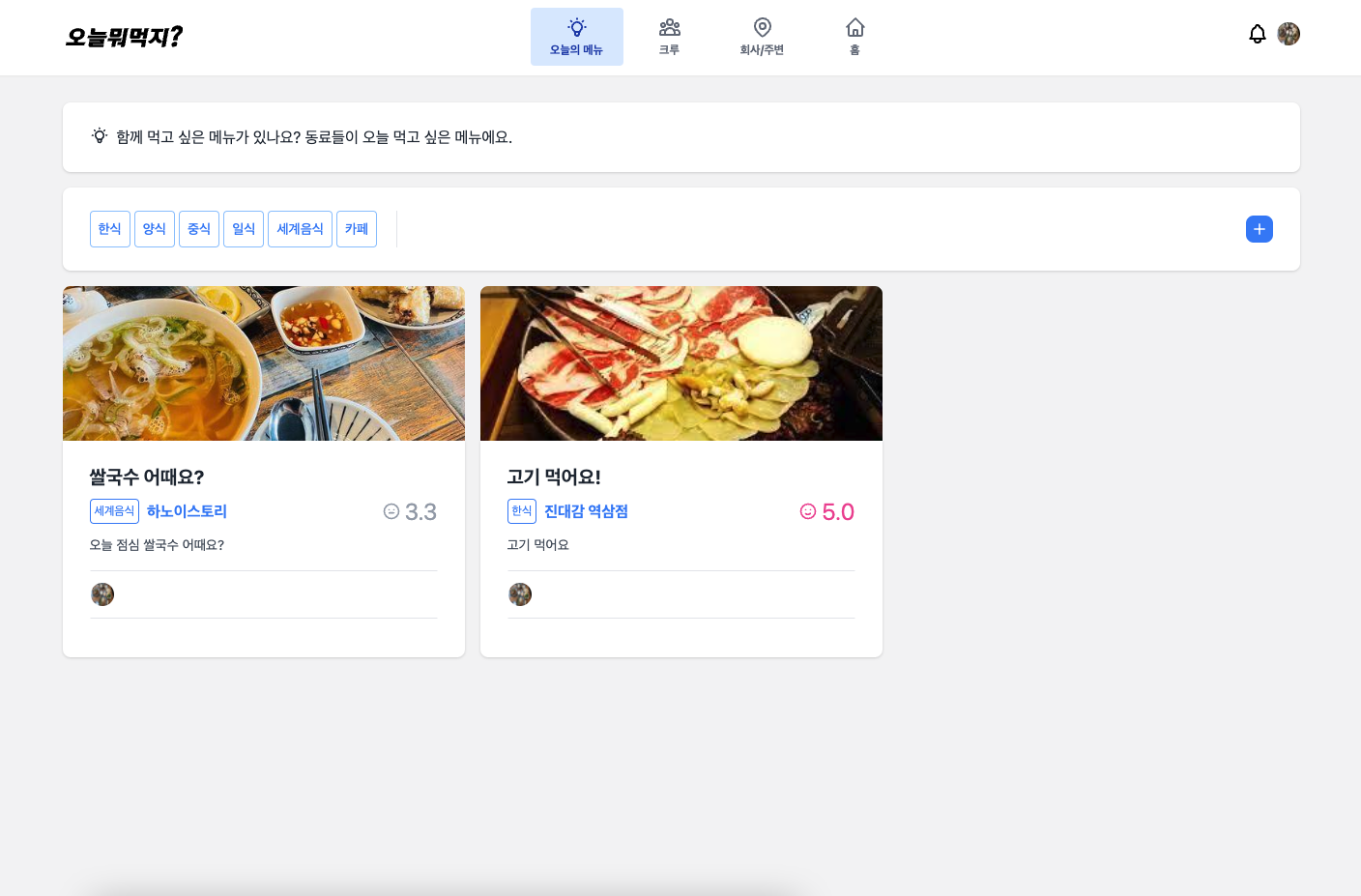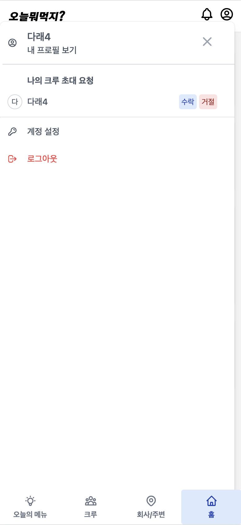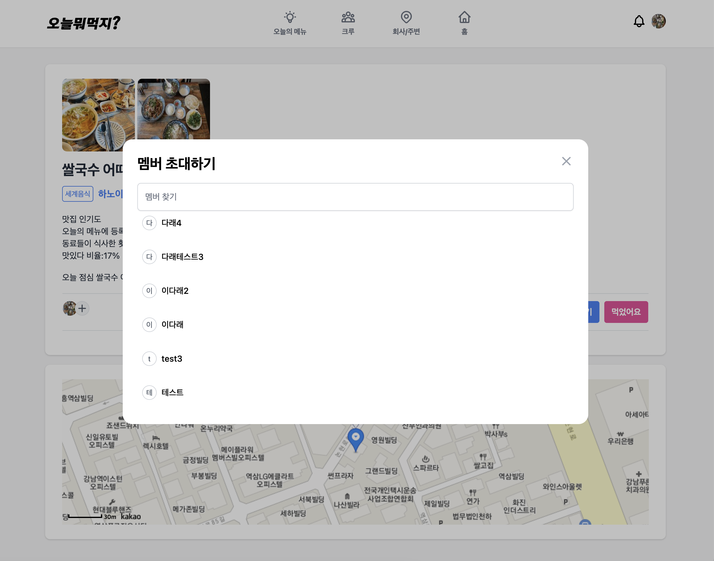 크루 상세 화면에서는 크루 멤버 목록을 보여주며 같은 회사 소속 유저를 초대할 수 있으며, 크루 멤버들끼리 오늘의 메뉴를 등록하고, 먹고싶은 메뉴에 투표할 수 있습니다. 크루 내 오늘의 메뉴 목록은 투표 득표 순으로 정렬되어 보입니다.