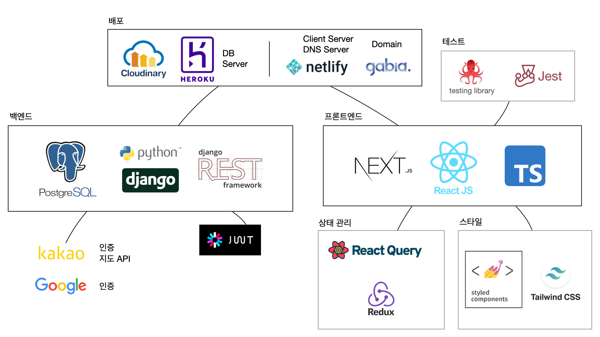 백엔드 서버와 DB는 heroku, 프론트엔드는 netlify 서버에 배포했습니다. 이미지는 cloudinary 서버에 업로드하고 주소를 DB에 저장했습니다. 도메인은 가비아에서 구입하였으며 DNS 서버는 netlify를 이용했습니다.(SSL 인증을 자동으로 해줍니다)