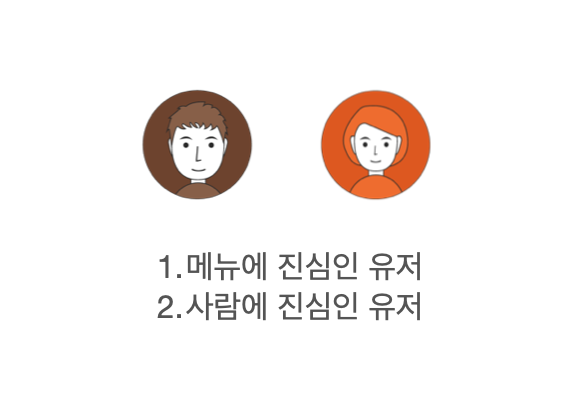 메뉴 제안 대상을 두 가지로 분리한 이유는 설정한 유저 페르소나 때문입니다. 먼저 유저는 직장인을 가정하고, 우리가 점심을 먹을 때 어떻게 행동하는지 생각해 보았습니다. 먹고 싶은 메뉴가 있어서 사내 누구와 먹어도 상관없이 같이 먹을 사람을 찾는 사람이 있고, 매일 점심을 먹는 멤버가 고정이 되어 있어서 그 안에서 메뉴를 결정해야 하는 사람이 있다고 생각했습니다. 이 두 필요를 기반으로 유저를 메뉴에 진심인 유저, 사람에 진심인 유저 두 성향으로 분류했습니다.