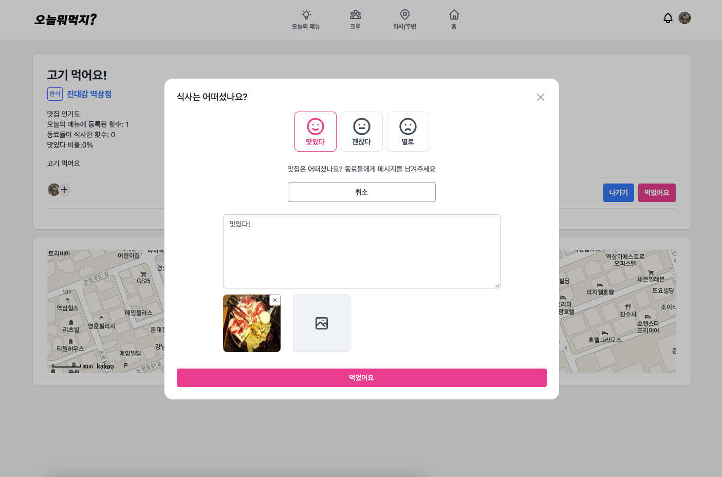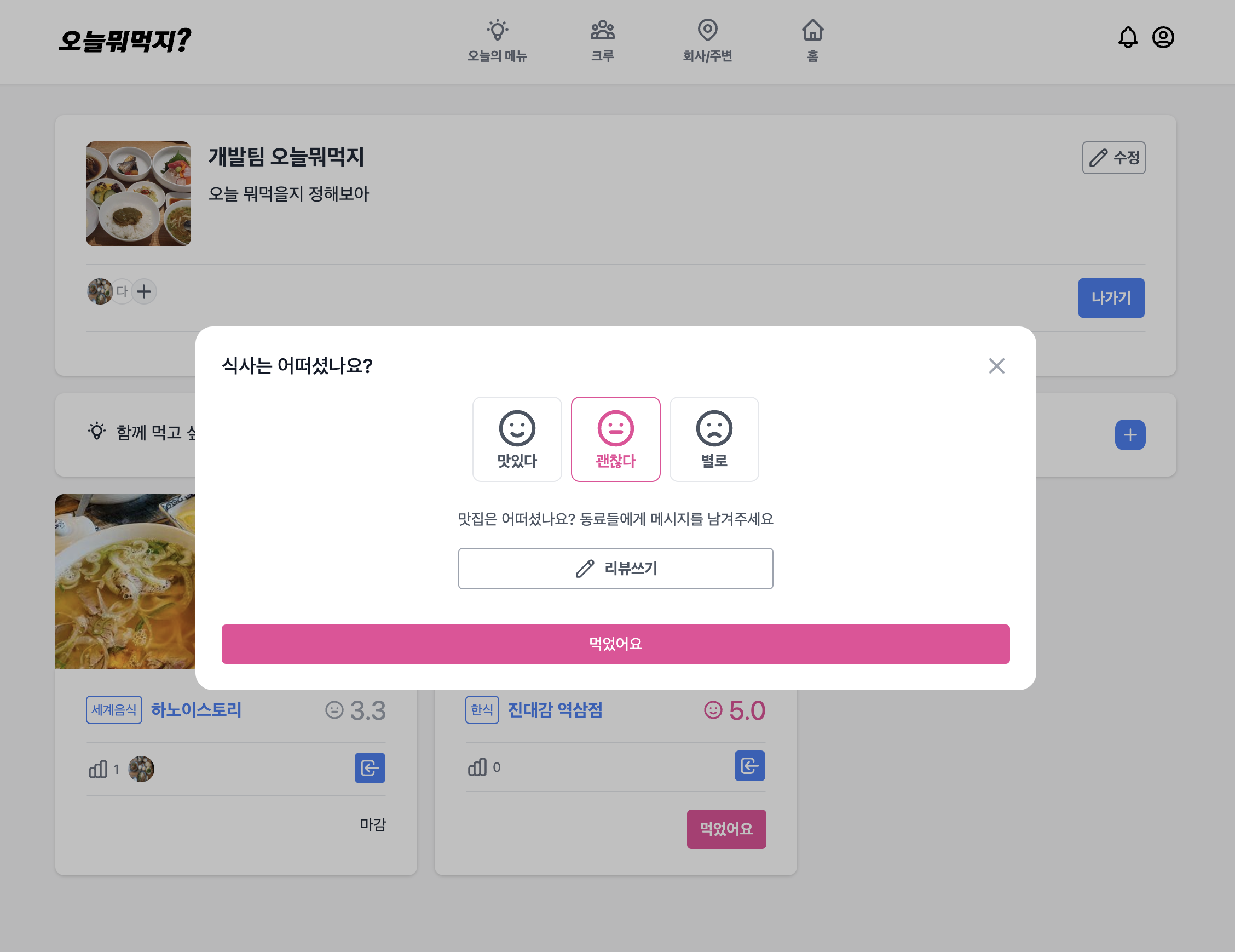 식사한 후에는 '먹었어요'를 통해 식사 완료 표시를 할 수 있으며 선택적으로 리뷰를 작성할 수 있습니다.