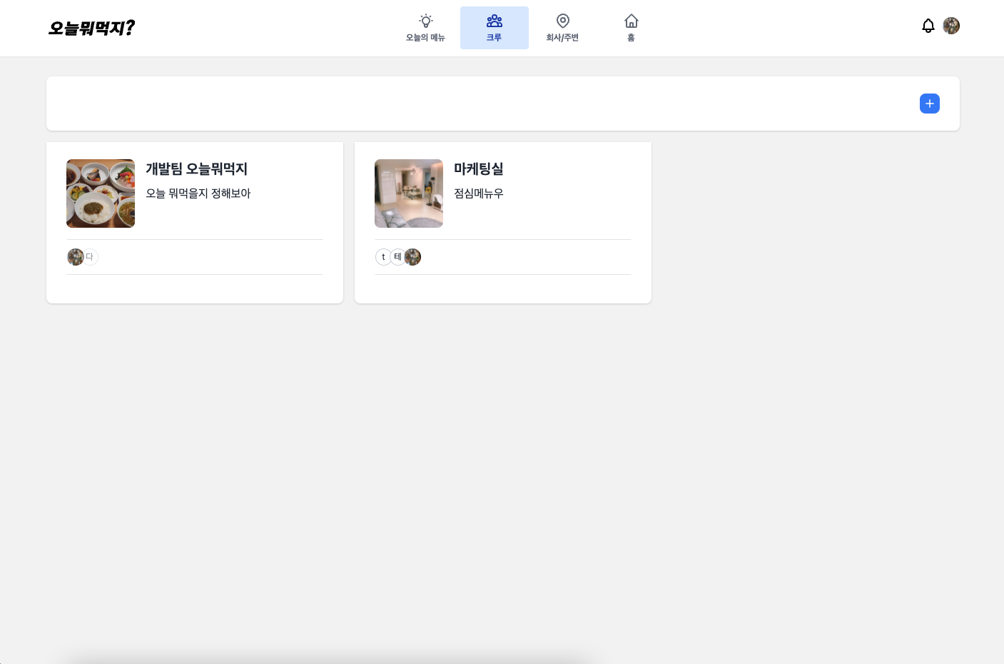 크루는 조직 내에서 구성된 소그룹 입니다. 점심 메뉴를 먹는 멤버가 고정되어 있을때 해당 멤버들을 하나의 크루로 구성할 수 있습니다. 사람에 진심인 유저를 위한 기능입니다. 매일 점심을 먹는 멤버들과 크루에서 의사소통할 수 있습니다. 크루는 크루 멤버 관리 기능과 오늘의 메뉴 투표 기능을 제공합니다. 크루에 먹고 싶은 메뉴를 올리고 크루 멤버들끼리 투표를 할 수 있습니다.