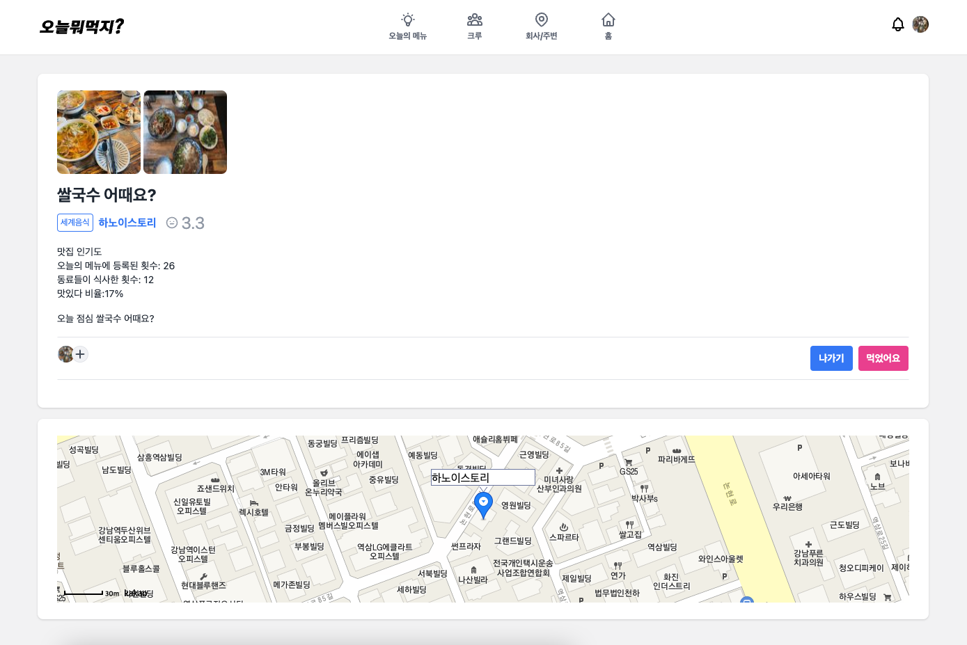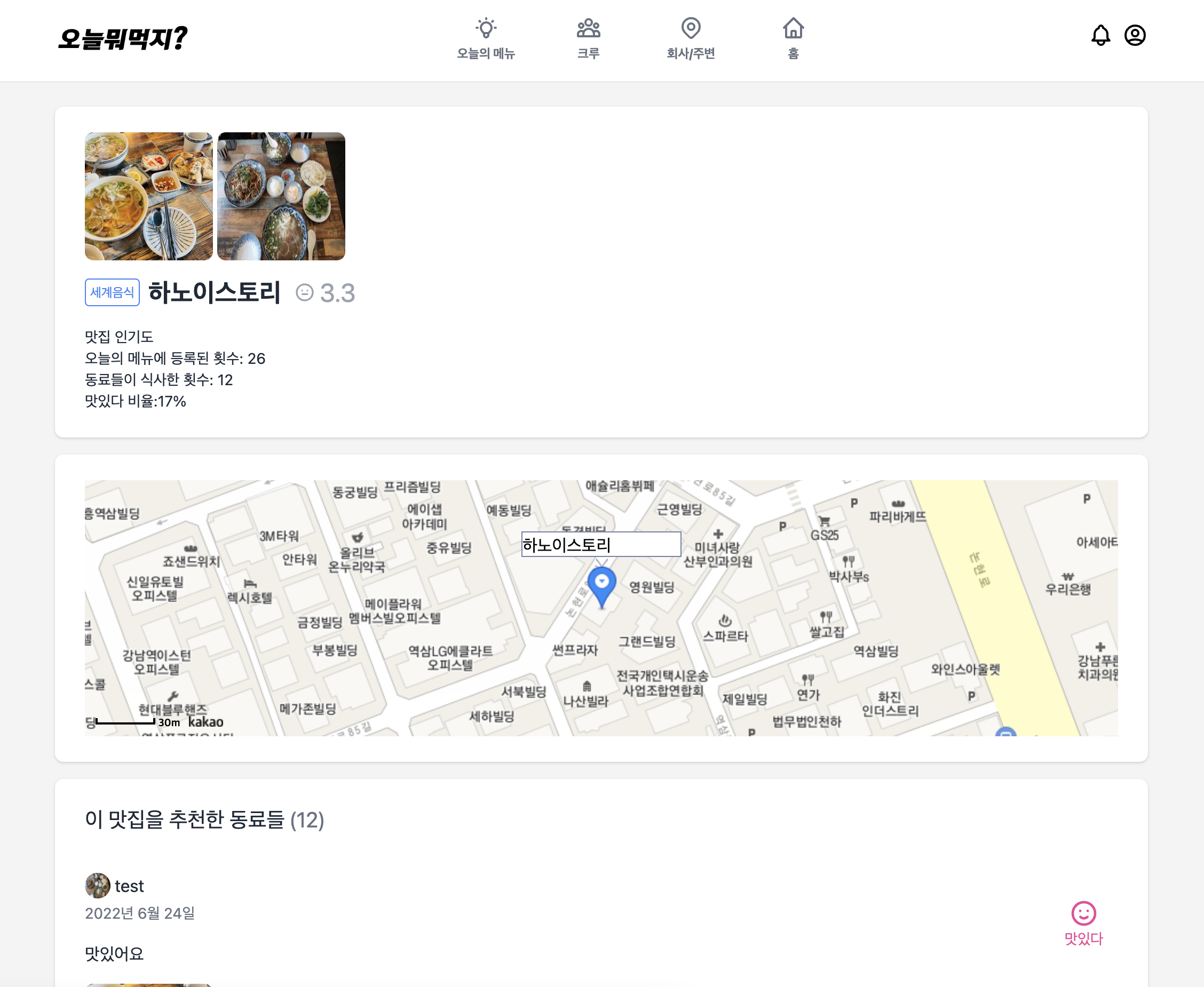 오늘의 메뉴 상세 페이지에는 연결된 맛집 정보와 참여 중인 멤버 목록을 보여줍니다. 맛집 정보로는 맛집 카테고리(한식, 양식, 중식..), 회사 내 오늘의 맛집에 등록된 횟수, 동료들이 식사한 횟수, 식사에서 받은 평점의 평균점수, 좋은 평가를 받은 비율, 카카오 맵 연동 지도 정보를 보여줍니다.