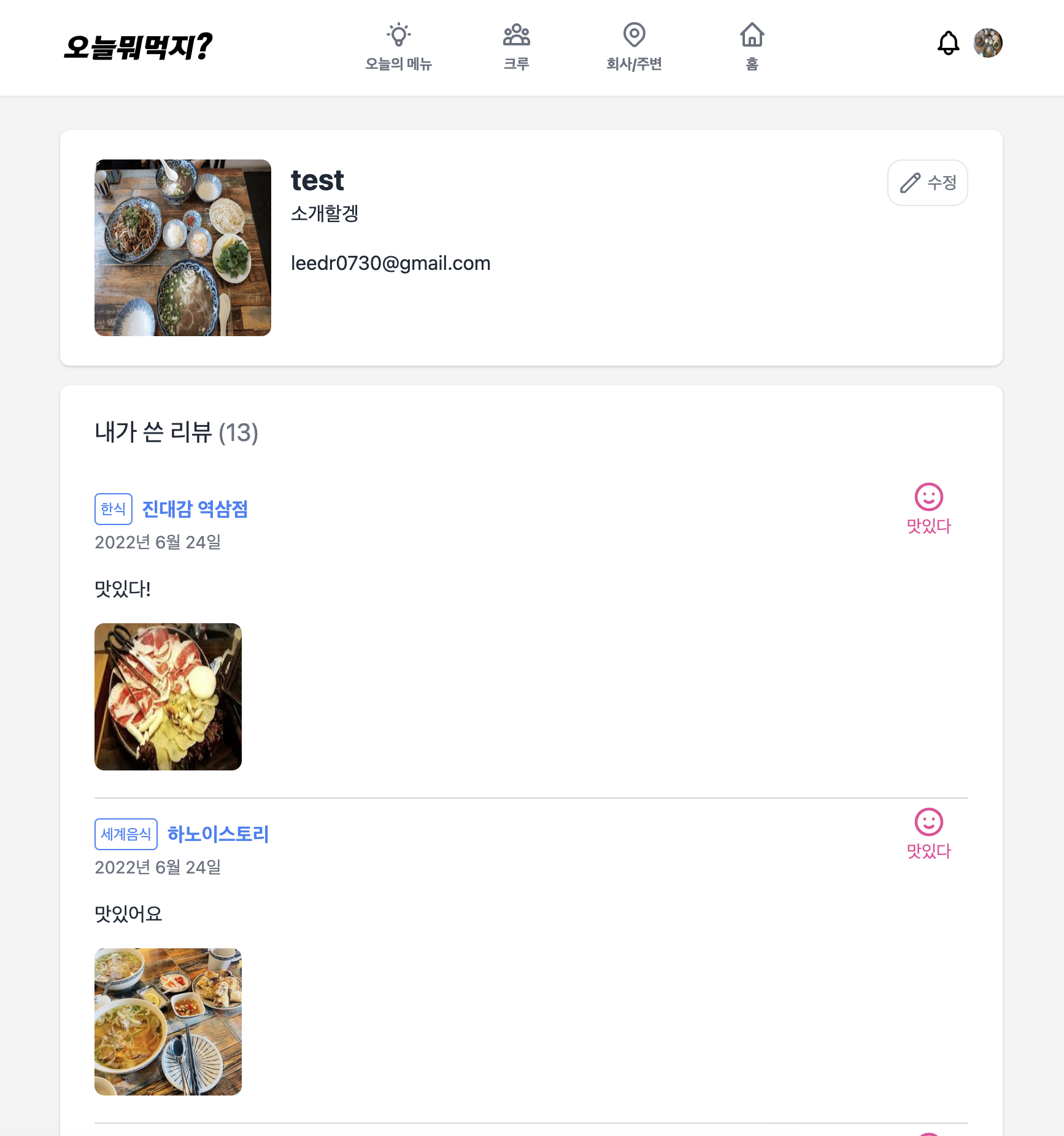 앞으로 식사 리뷰 데이터를 활용한 회사 내 인기 맛집 추천 등 다양한 기능을 계획 중이니 많은 관심 가져주시면 감사하겠습니다:)
