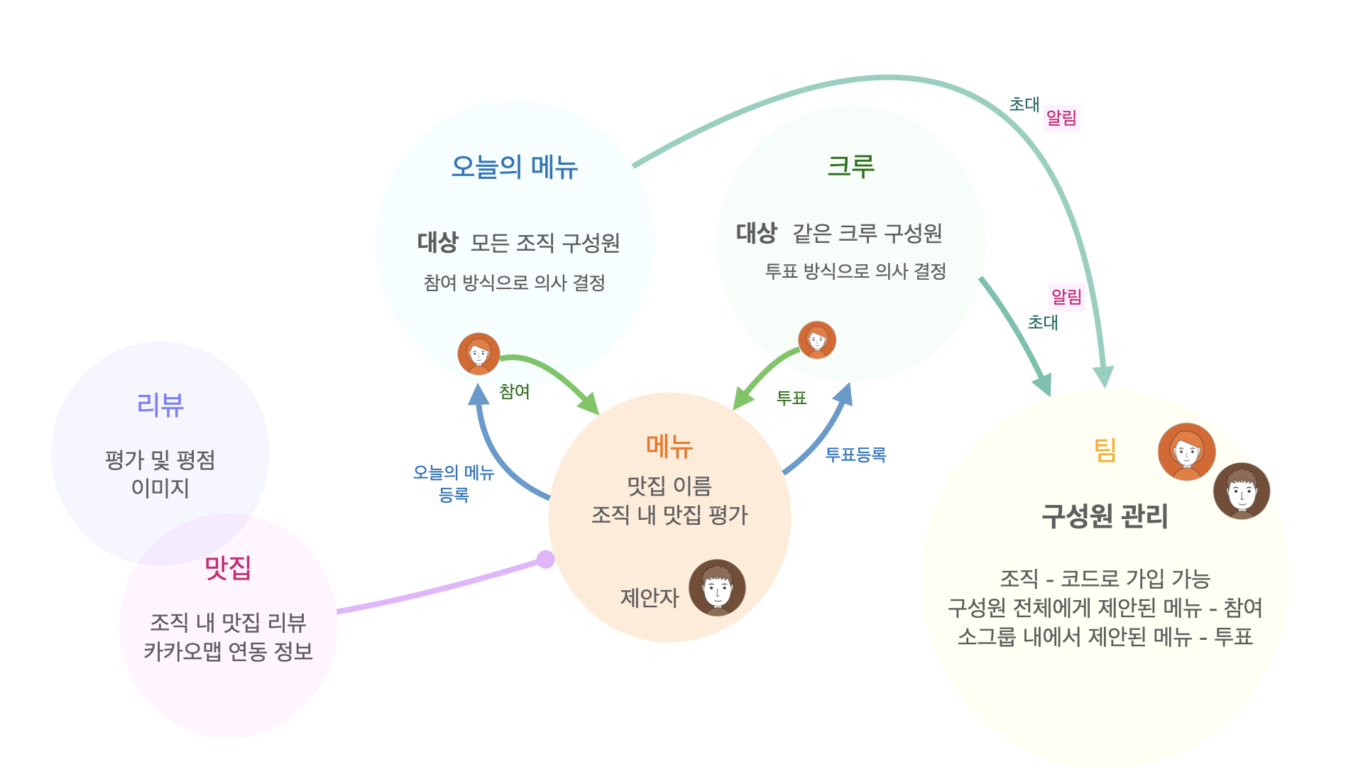 이와 같이 유저는 자신의 선호에 따라 메뉴 제안을 모든 구성원을 대상으로 할 수도 있고, 자신이 원하는 멤버를 별도의 소그룹으로 구성하여 그 안에서 제안할 수도 있습니다.