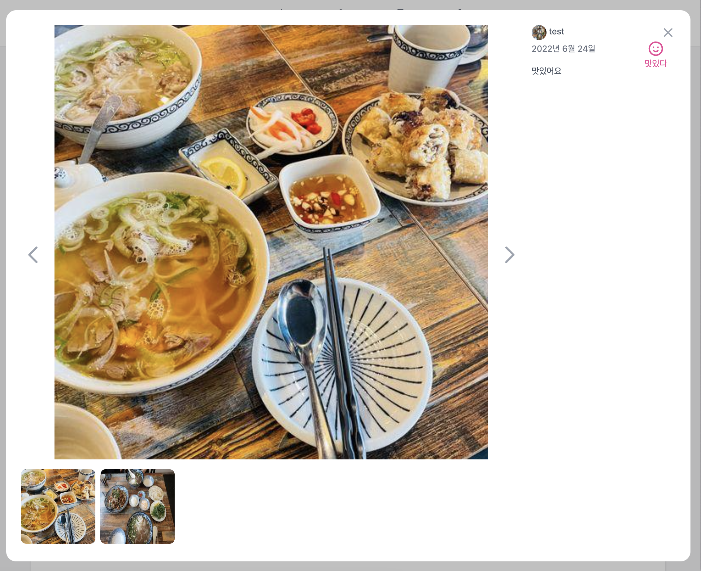 맛집 이름을 클릭하면 맛집 정보를 확인할 수 있습니다. 맛집 리뷰와 지도 정보를 확인할 수 있습니다. 이미지를 클릭하면 모달 창을 통해 크게 볼 수 있습니다.