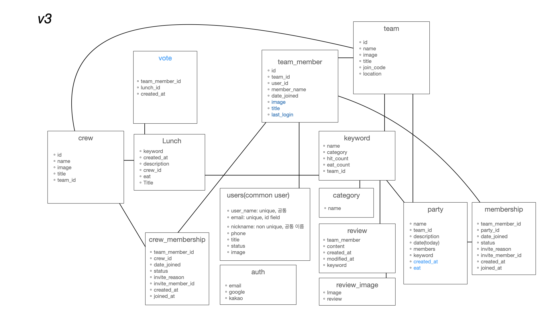 크루는 런치로 표현된 추천 메뉴와 1:n 매칭 됩니다. 추천 메뉴는 투표와 1:n 매칭되며 투표는 유저와 1:1 매칭됩니다. 유저는 여러 메뉴에 중복 투표할 수 있습니다. 크루는 크루 멤버쉽과 1:n 매칭되어 크루 멤버를 관리합니다. 크루 멤버쉽을 통해 유저는 크루에 가입, 탈퇴, 초대(요청, 승인, 거절)할 수 있습니다. 크루 내 오늘 점심 메뉴 결정은 추천 메뉴와 투표를 통해 결정됩니다. 추천 메뉴는 키워드와 1:1 매칭됩니다. 각 추천 메뉴 당 '식사했어요'를 통해 키워드에 리뷰 작성이 가능합니다.