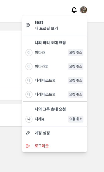 전체 구성원에게 공개된 제안에 참여한 유저는 원하는 유저를 특정하여 참여 요청을 보낼 수 있습니다. 유저는 자신의 탭에서 받은 요청을 조회할 수 있으며, 수락과 거절이 가능합니다. 또한 소그룹에 속한 유저는 원하는 유저에게 소그룹 참여 요청을 보낼 수 있습니다. 마찬가지로 받은 요청은 유저 메뉴 창에서 조회할 수 있습니다.