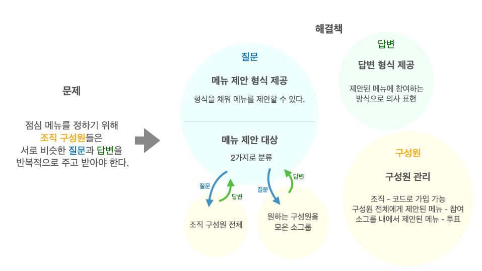 점심 메뉴 선정시 불편한(번거로운) 이유는 비슷한 질문과 답변이 매일 반복된다는 점에서 발생한다고 생각했습니다.